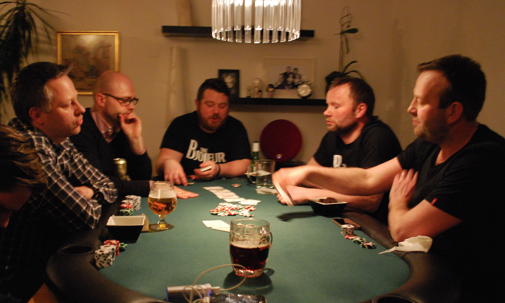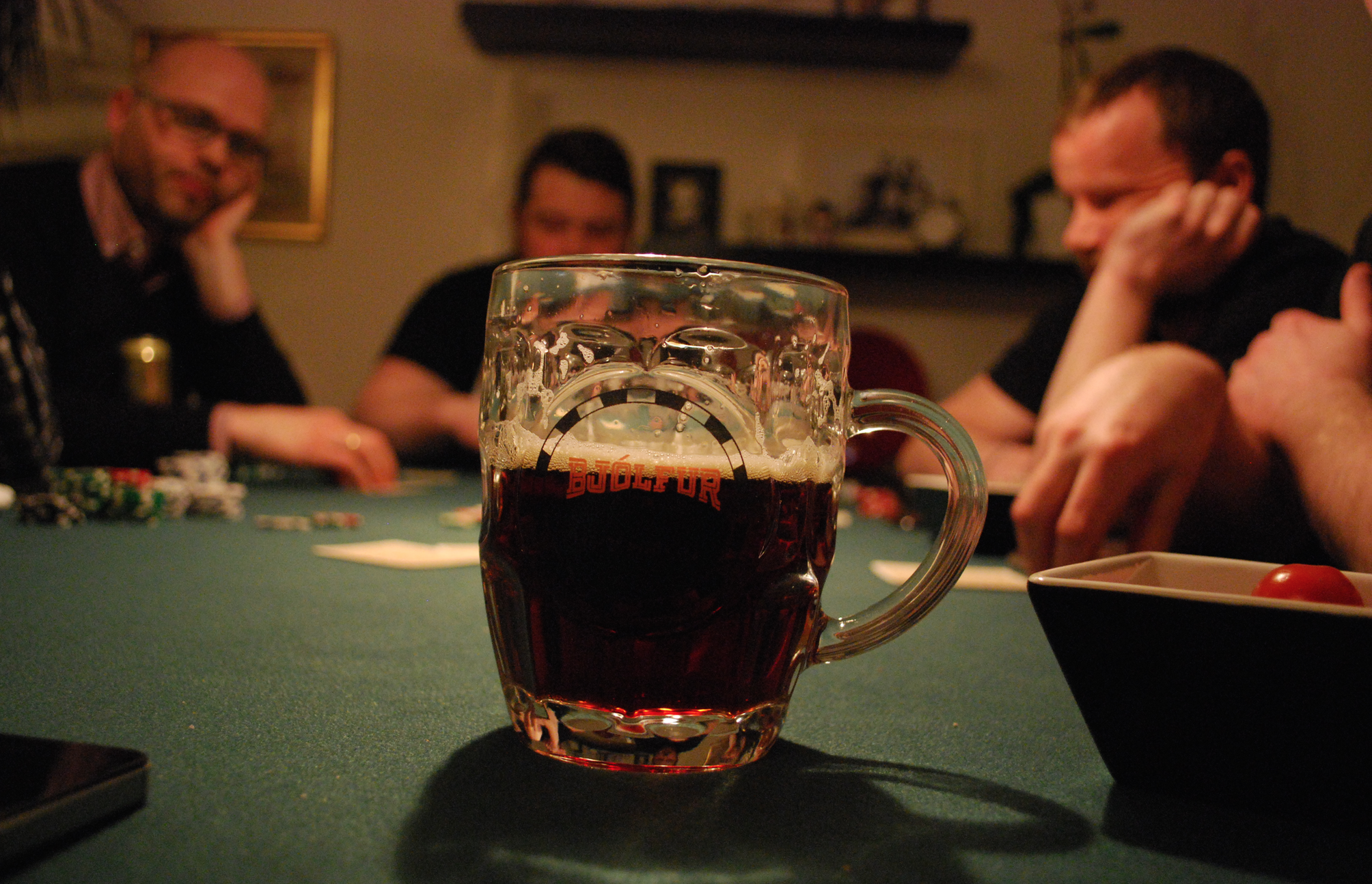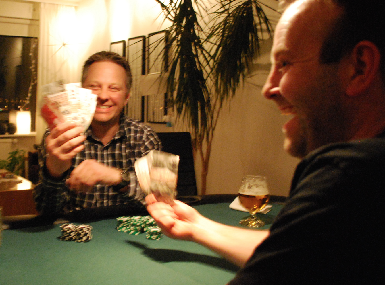 Eitt bjórstig skilaði sér í hús í kvöld og það var Bótarinn sem tók það. Svakaleg hönd þar sem hann blöffaði og fékk Timbrið til að folda á móti ég og taka sætan sigur og bjórstig. Hann jafnaði þar með Timbrið í bjórkeppninni þar sem þeir eru nú báðir með 3 stig og líta vel út…spurning hvort annar þeirra nær að taka stig í bústaðnum og stela sigrinum í lokin.