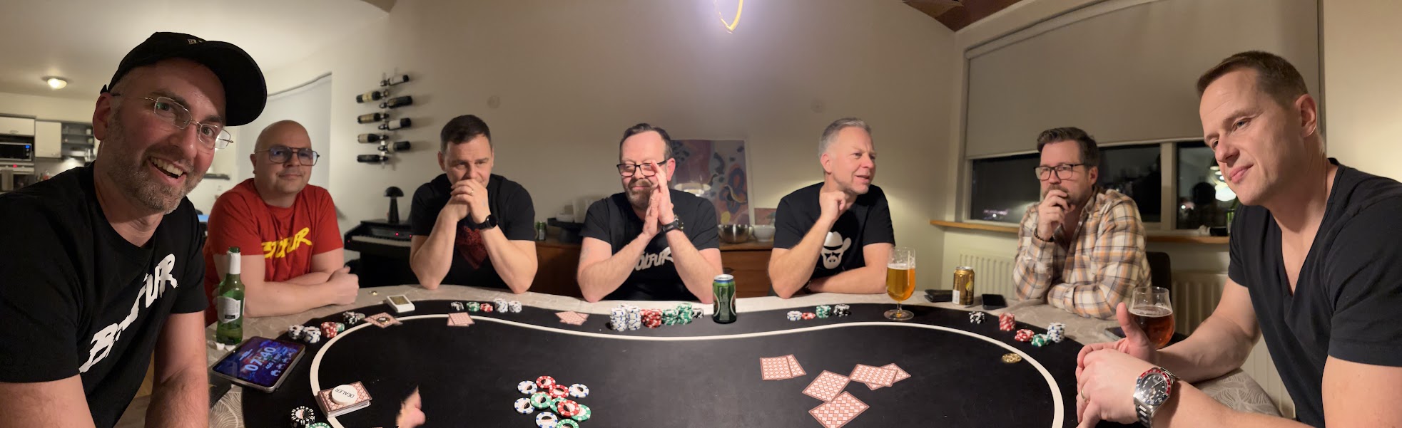 Annað borðið hóf kvöldið með öllu meiri „látum“ í innkaupum 😉 og peningarnir skiptust ört um hendur og menn voru duglegir að kaupa sig aftur inn. En eins og reyndir menn vita skipti það í raun engu hvað gerðist fyrir hlé — því eftir hlé byrjaði hið raunverulega mót. Þá fóru menn að detta út, og kvöldið tók á sig alvöru keppnisbrag.