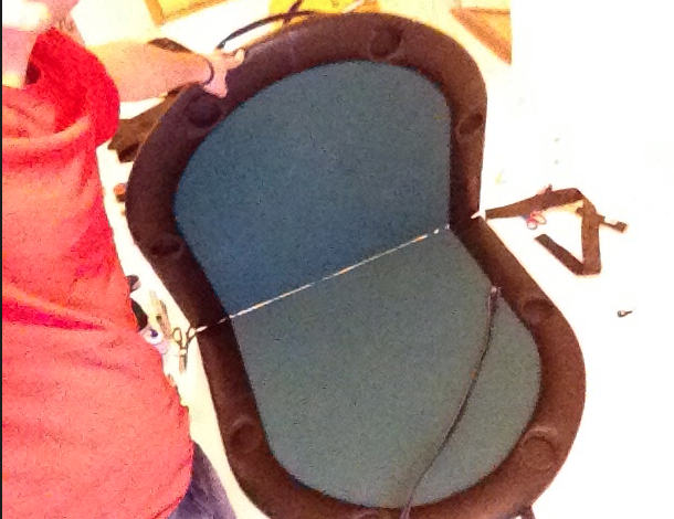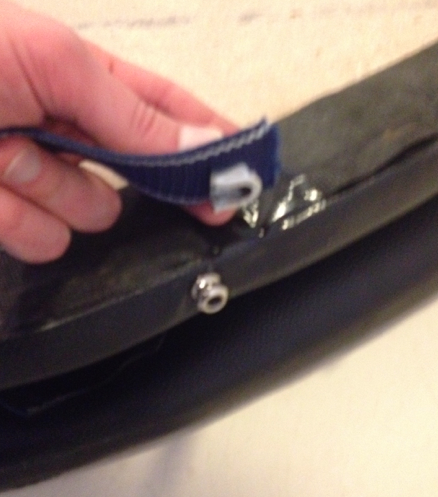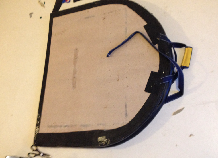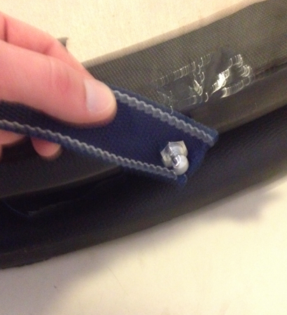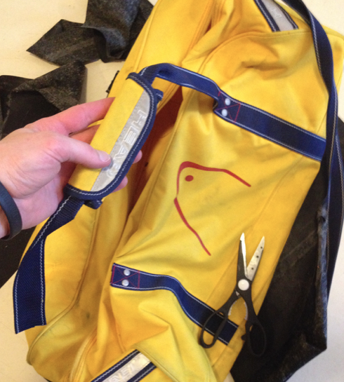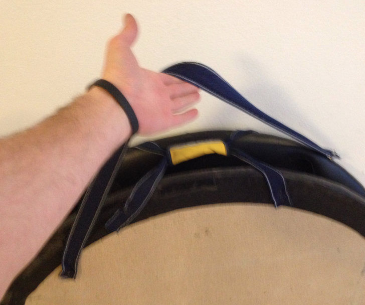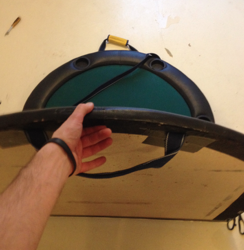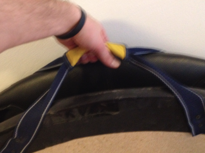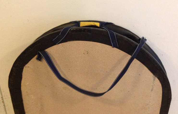 Notaði gömul handföng af íþróttatösku til að halda á borðinu. Skellti einni axlahaldinu af íþróttatöskunni á borðið og festi það öðru megin með gítarólarsmellu þannig að auðvellt er að losa axlarólina. Til að auka enn á þægindin smellti ég axlapúða af Römer King barnabílstól á þannig að ólin væri ekki að skerast í öxlina.