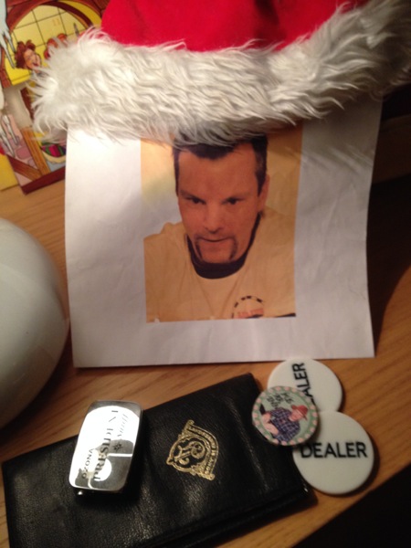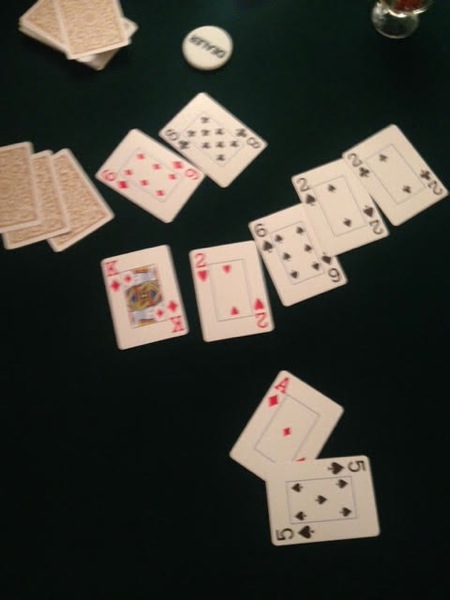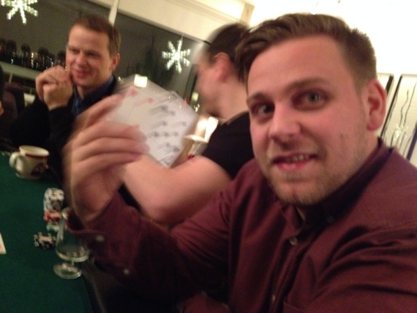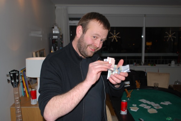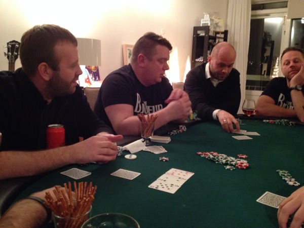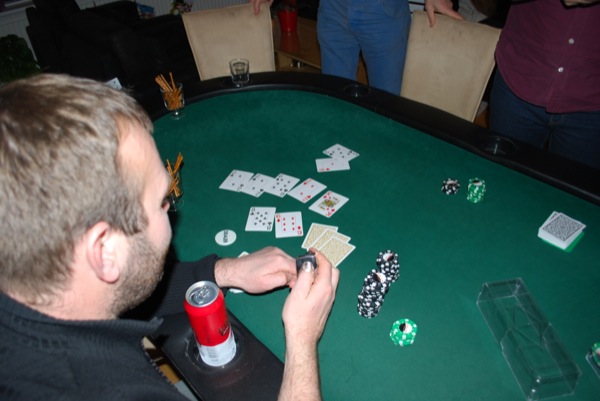 Spilið hófst og þrátt fyrir að við vorum níu við borðið tókst Timbrinu að landa einu bjórstigi…enda með 2 pör sem tryggði honum góðan pott og jók forystu hans í 3 stig í bjórstigakeppninni. Hann var að hitta á sjöu-tvist nokkrum sinnum en þurfti s.s. ekkert að stressa sig á að gera mikið úr þeim með svona góða forystu í bjórkeppninni.