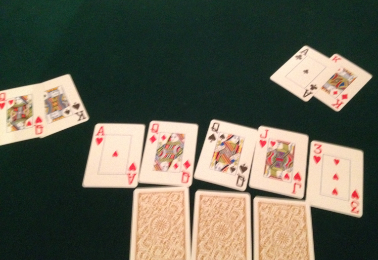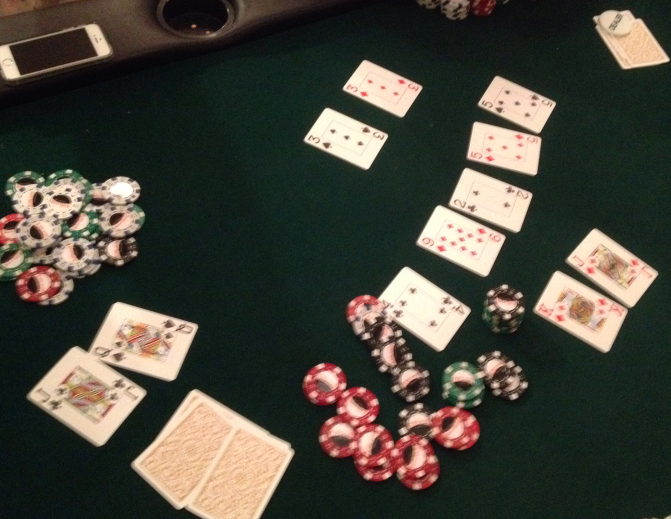 Fyrst spil í borð var Á♥ og Iðnaðarmaðurinn fagnaði en hann tók það fljótt til baka þegar að Q♦ og Q♠ mættu með ásnum í floppinu. J♥ gaf von um split en 3♥ á river tryggði drottningunum sigur og þar með Timbrið sem tók annað kvöldið sem og þúsarann og 2 bjórstig, nokkuð góð uppskera þó svo að stig og verðlaunafé hafi ekki verið há sökum fárra spilara.